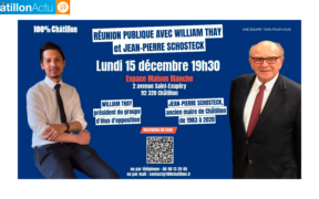 Après une première réunion publique marquée par la présence de près de 150 Châtillonnais réunis à l’Espace Maison Blanche, et surtout le soutien affiché de l’ancien maire Jean-Pierre Schosteck, le collectif 100 % Châtillon autour ...