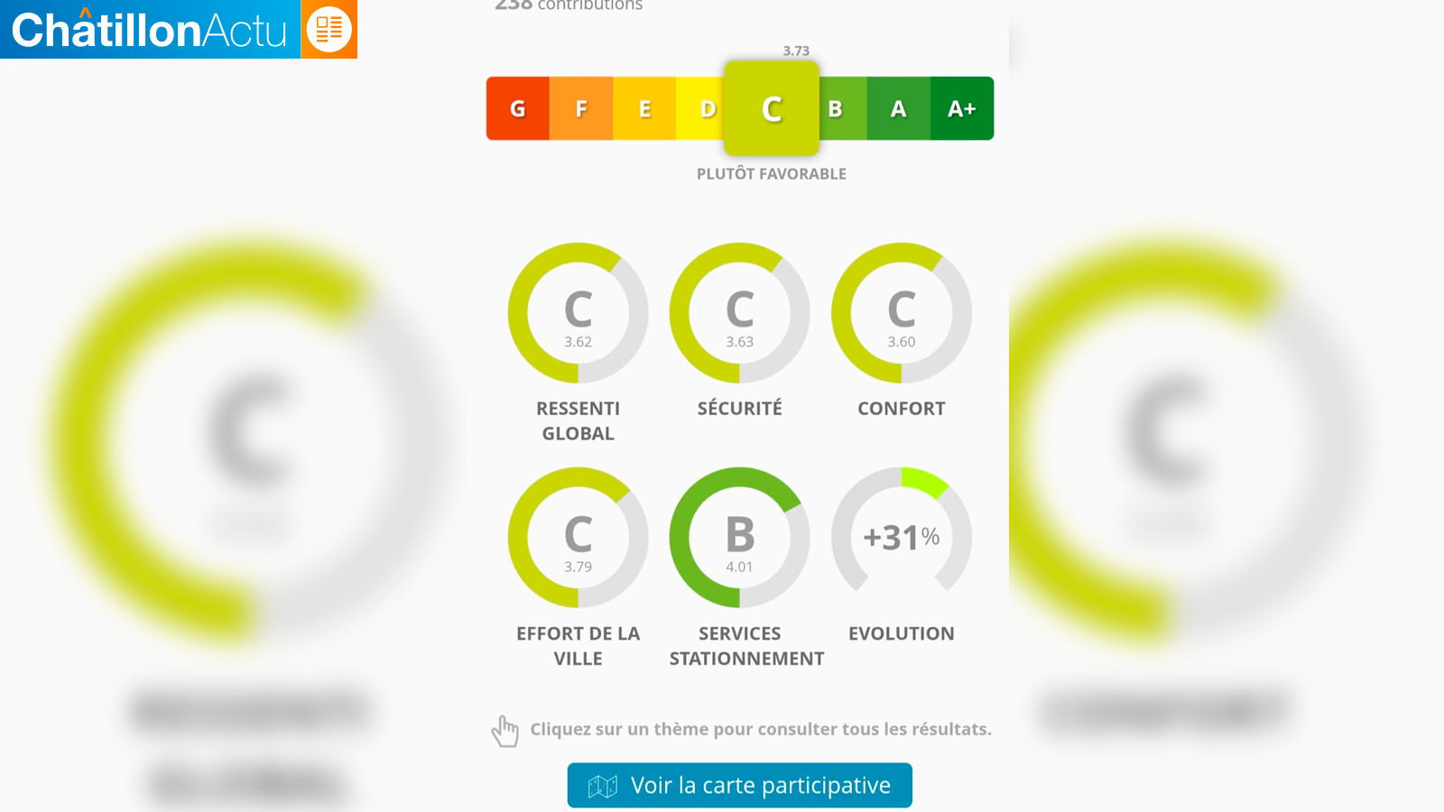 Ce score a été établi par 238 contributeurs qui ont évalué 6 items (ressenti global, sécurité, confort, effort de la ville, services et stationnement, évolution) et annoté précisément une carte en ligne.