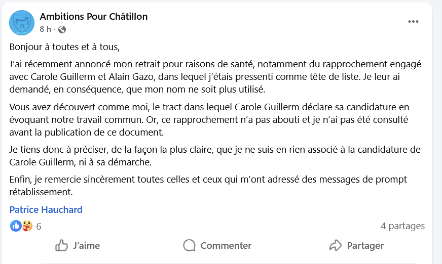 Sur le plan politique, la portée de ce message est significative. Patrice Hauchard, investi comme chef de file par Les Républicains à Châtillon avant son retrait, incarnait une forme de légitimité politique et de capacité de rassemblement pour une partie de l’électorat de droite et du centre.
