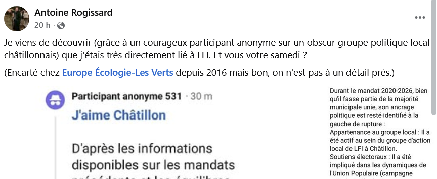 • la présence de La France insoumise au sein de la liste J’aime Châtillon alors même que ce n’est pas le cas, un élu de l’équipe de Nadège Azzaz a du dénoncer cette fausse information le concernant