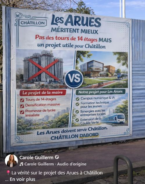 Dernier exemple en date : une publication diffusée aujourd’hui sur les réseaux sociaux concernant le projet d’aménagement des Arues. La candidate y diffuse une image présentée comme étant celle du projet municipal de Nadège Azzaz alors même qu’elle n’a rien à voir avec Châtillon
