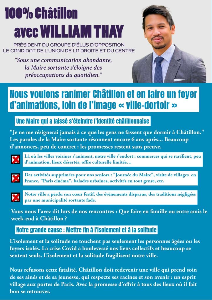 Au cœur de ce nouveau tract, William Thay met en avant une priorité politique : la lutte contre l’isolement et la solitude, présentée selon lui comme un enjeu majeur du quotidien à Châtillon.