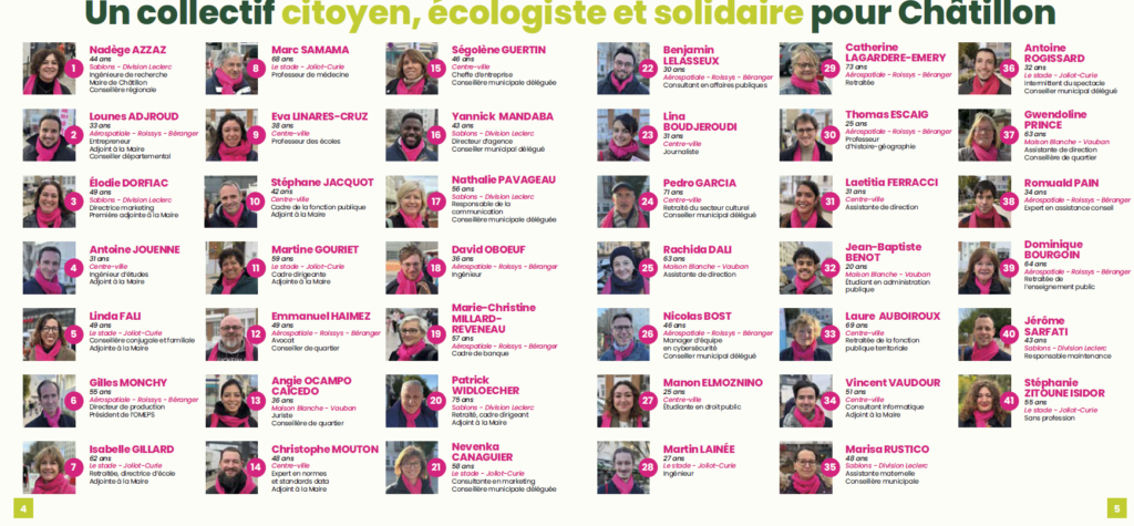 Depuis deux jours, le programme de J’aime Châtillon est également diffusé dans l’ensemble des boites aux lettres des Châtillonnaises et Châtillonnais. La Maire dévoile ainsi son équipe de 41 femmes et hommes engagés au service de la ville, ainsi que plus de 200 propositions, dans la continuité du 1er mandat porté par ce collectif citoyen, écologiste et solidaire.