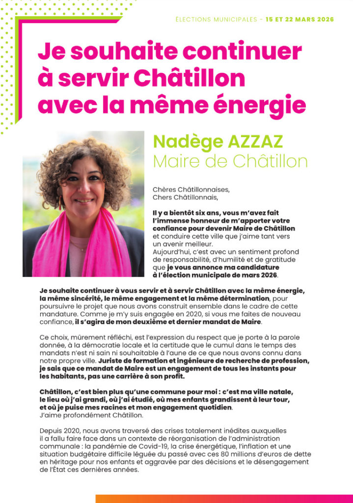 Je souhaite poursuivre le travail engagé depuis 2020 et continuer à servir Châtillon avec la même énergie et la même sincérité. Lors de mon premier mandat, vous m’avez accordé votre confiance pour transformer durablement notre ville. Malgré des crises inédites : pandémie, crise énergétique, inflation, situation budgétaire difficile, nous avons avancé ensemble et réalisé plus de 90 % du programme présenté en 2020, tout en réduisant la dette de 15 millions d’euros et sans augmenter les impôts. Il reste encore beaucoup à faire, et j’ai le sens du devoir : c’est cela qui me pousse à continuer.