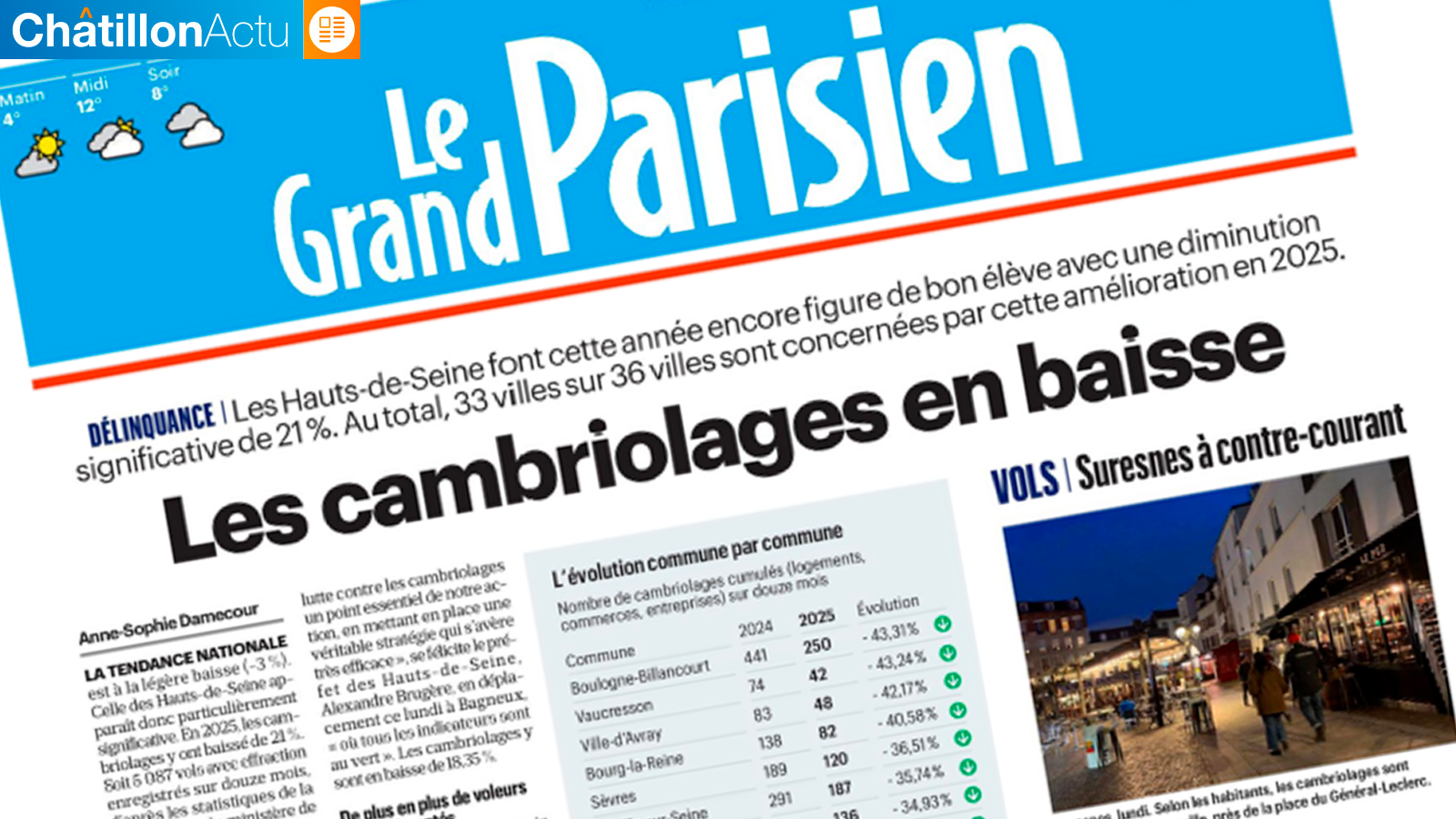 Selon les données relayées par Le Parisien, la délinquance est en recul à Châtillon, avec une diminution de 28 % des cambriolages. Une évolution qui s’inscrit dans la durée et confirme la trajectoire engagée ces dernières années, en lien avec le travail coordonné de la Police nationale et de la Police municipale.